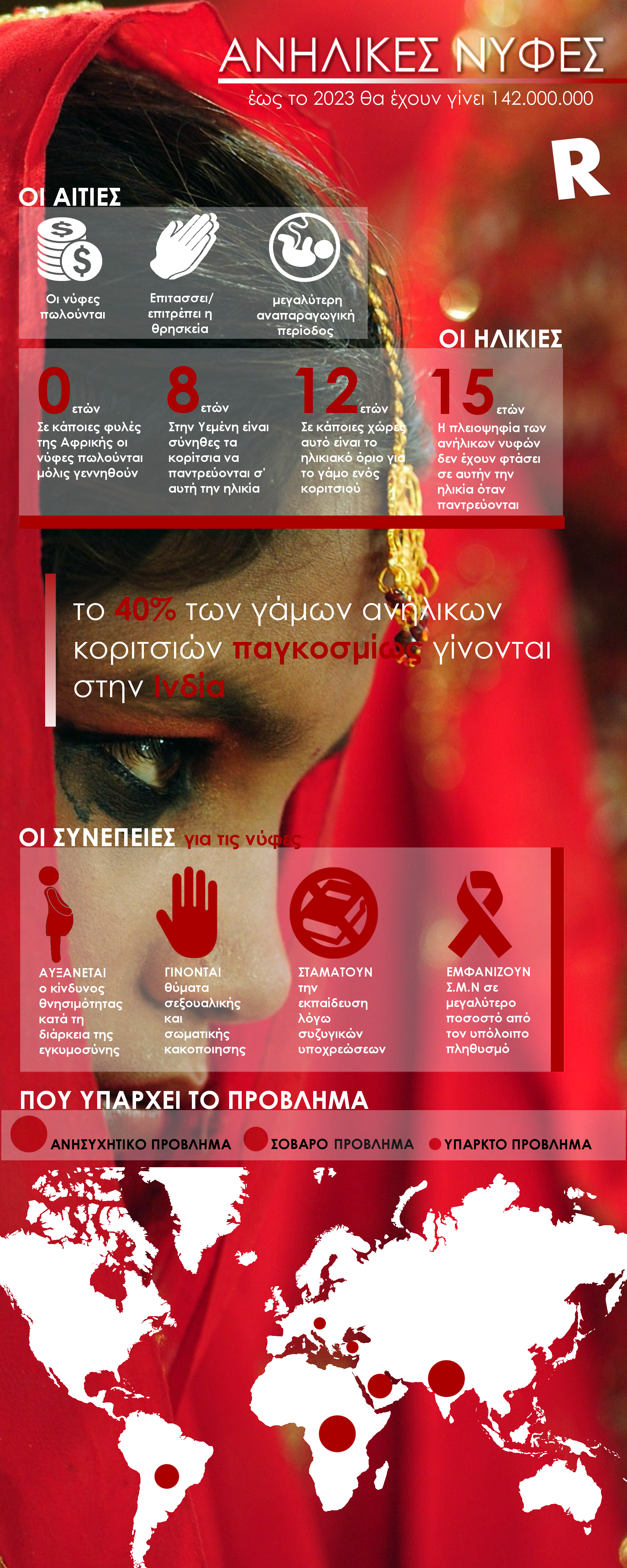 Εμείς επιλέξαμε έναν μόνο τομέα για να απεικονίσουμε την κατάσταση με τη γλώσσα των αριθμών και αυτός είναι ο γάμος των ανήλικων κοριτσιών με μεγαλύτερους -ενίοτε και υπερήλικους- άνδρες. Το φαινόμενο αυτό έχει διαστάσεις σε όλο τον κόσμο, όμως οι κύριες εστίες του είναι η Υποσαχάρια Αφρική, οι Ινδίες, το Πακιστάν και κάποιες χώρες της Μέσης Ανατολής. Παρά τις όποιες προσπάθειες γίνονται, το φαινόμενο δεν εκλείπει και οι προβλέψεις αναφέρουν ότι σε μερικά χρόνια από τώρα, οι ανήλικες νύφες θα φτάσουν τα 142.000.000!