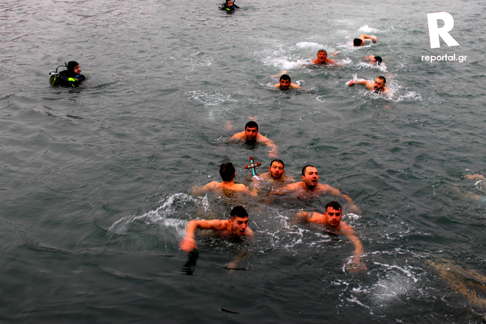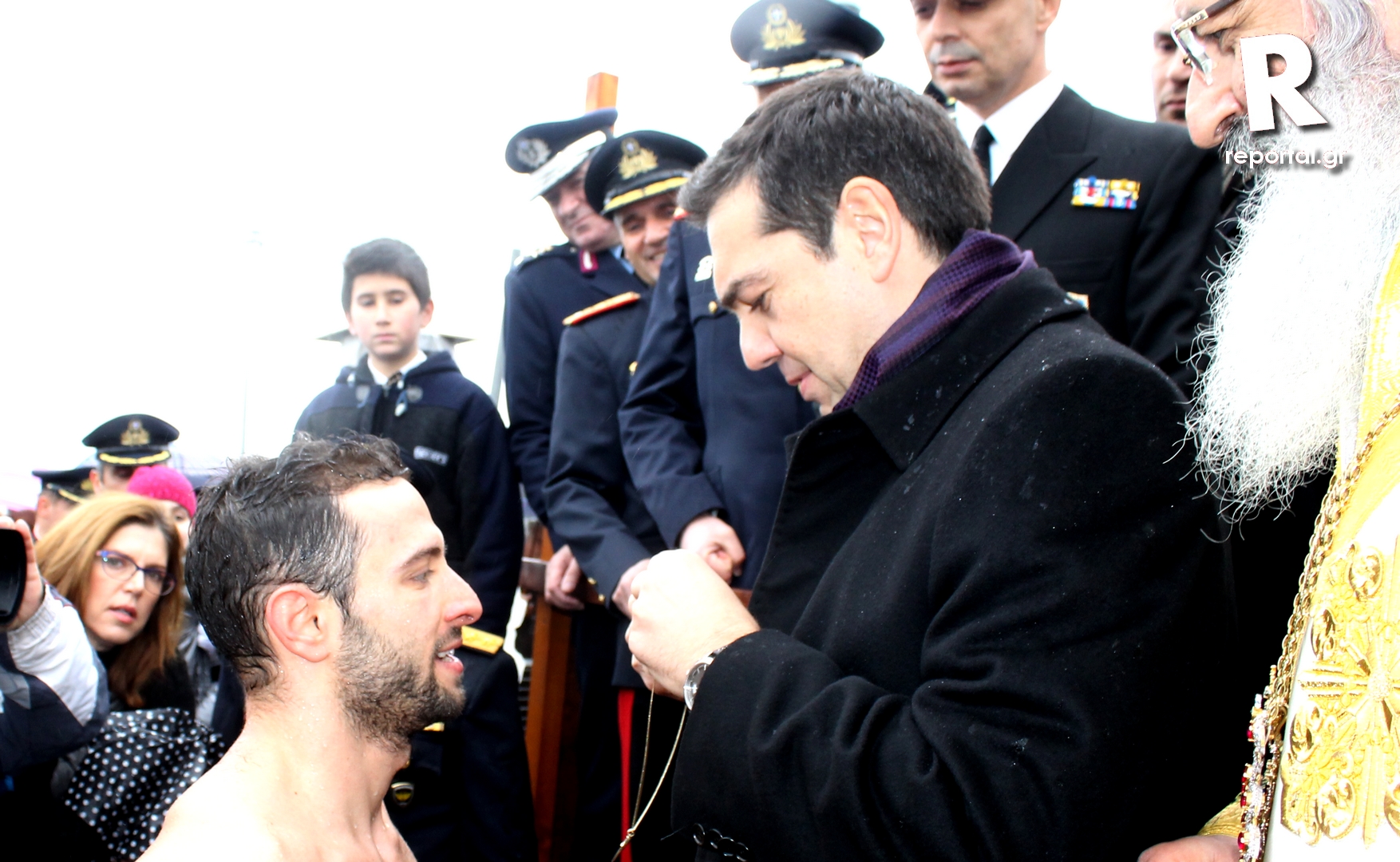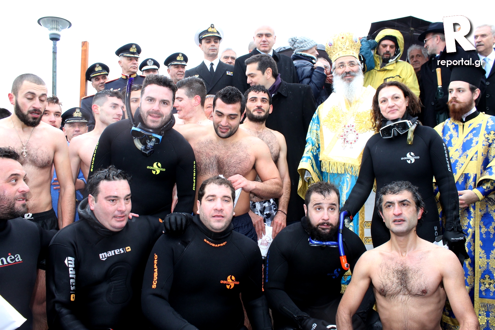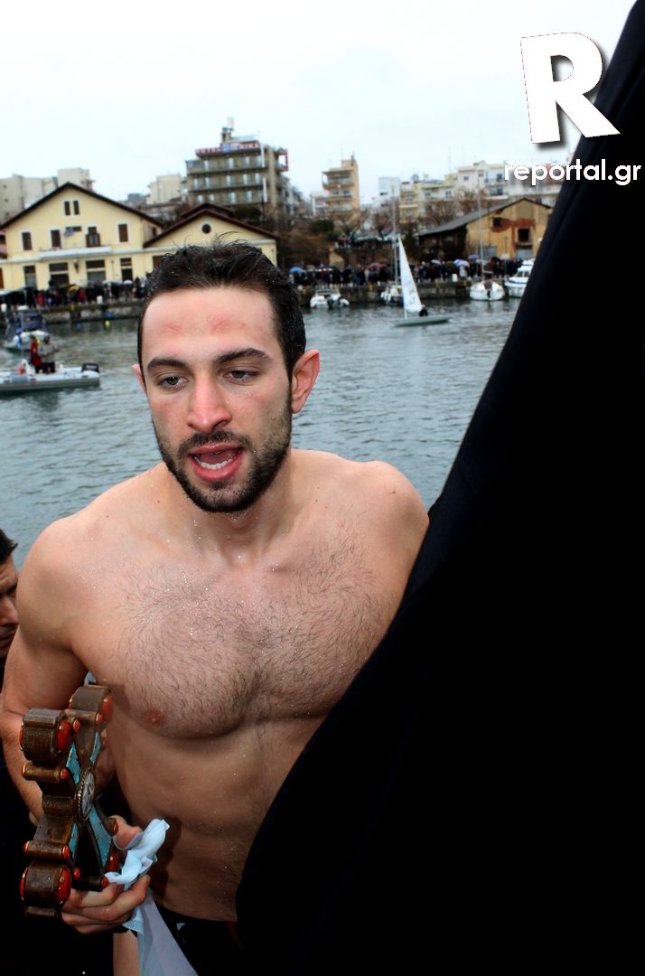Από τους περίπου 15 κολυμβητές που βούτηξαν στα παγωμένα νερά, ταχύτερος ήταν ο 25χρονος αθλητής και προπονητής του ΟΦΘΑΑ, Αργύρης Τυλιγαδάς, ο οποίος ανταμείφθηκε με έναν χρυσό σταυρό τον οποίο πέρασε στο λαιμό του ο Πρωθυπουργός Αλέξης Τσίπρας.