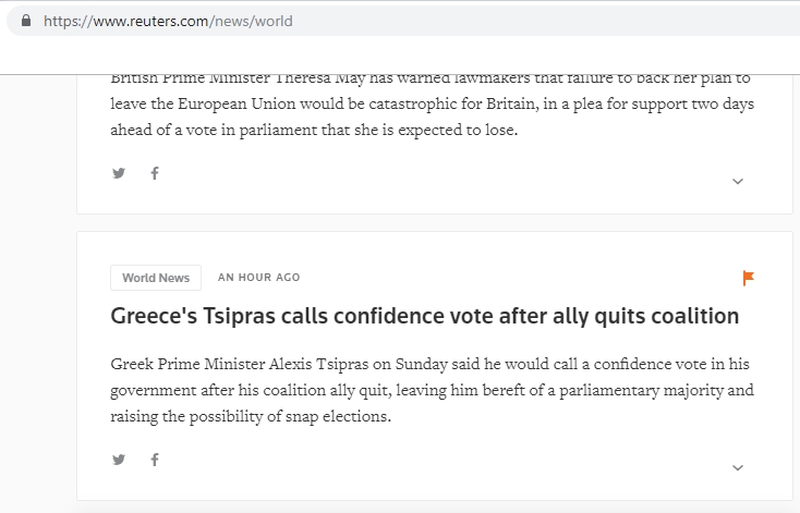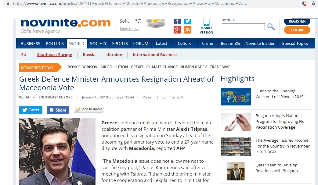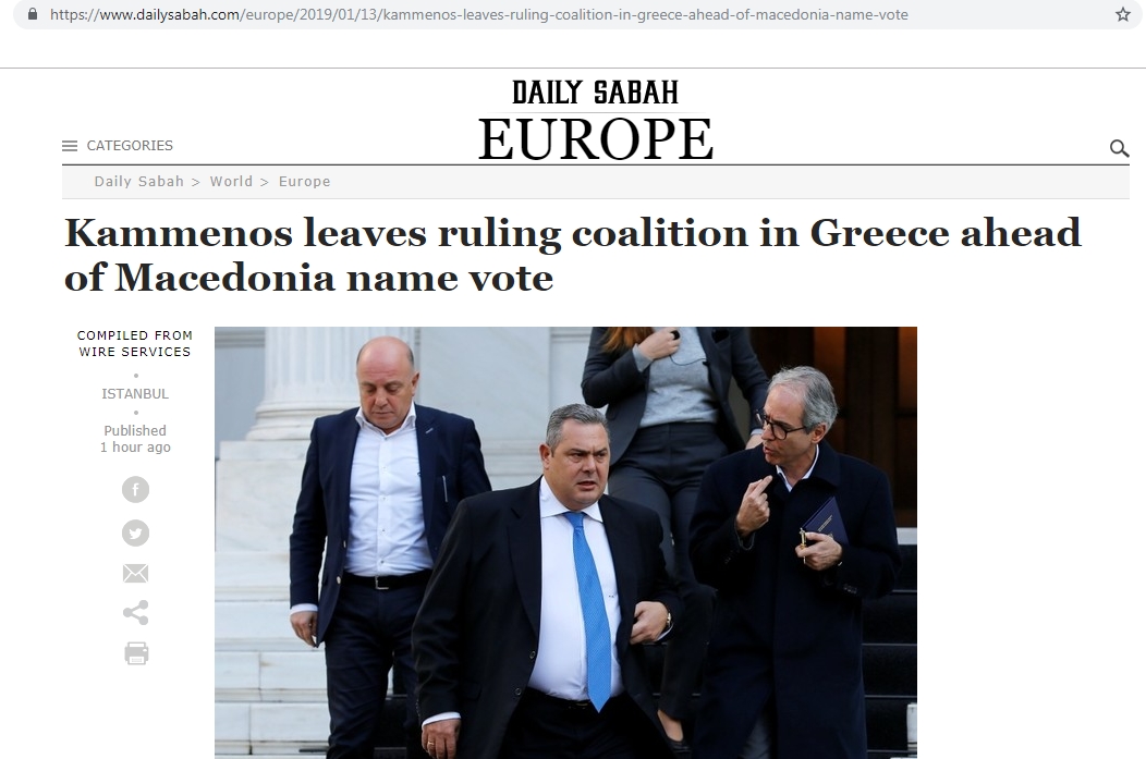 Το γύρο του κόσμου κάνει η είδηση της αποχώρησης του Πάνου Καμμένου από την ελληνική κυβέρνηση. Ο Υπουργός Εθνικής Άμυνας επιβεβαίωσε τελικά τα σενάρια που τον ήθελαν να αποχωρεί από τον κυβερνητικό σχηματισμό, ελέω “μακεδονικού”. Από το Reuters μέχρι την τουρκική Daily Sabah, τα πρακτορεία ειδήσεων και οι μεγάλες εφημερίδες όλου του κόσμου έχουν αφιερώσει δημοσιεύματα στο χρονικό του προαναγγελθέντος θανάτου της κυβερνητικής συνεργασίας ΣΥΡΙΖΑ – ΑΝΕΛ