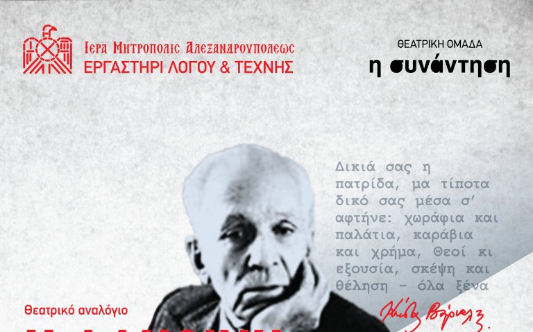 Μία πολύ ενδιαφέρουσα πρόταση κομίζει στα θεατρικά πράγματα της Αλεξανδρούπολης η Θεατρική Ομάδα “η Συνάντηση” που τις προσεχείς ημέρες παρουσιάζει στο Πνευματικό Κέντρο της Ι.Μ.